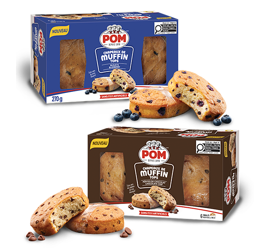 Découvrez les dessus de muffin POM🅫 — la meilleure partie du muffin, maintenant une gâterie à part entière. Préparés avec des bleuets et de vrais morceaux de chocolat, ils sont moelleux, savoureux et prêts à vous suivre partout.