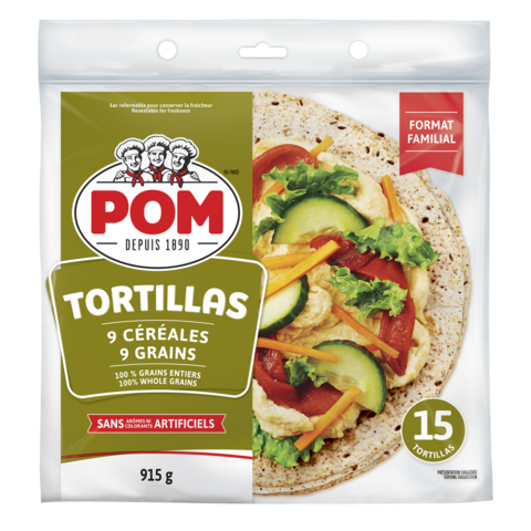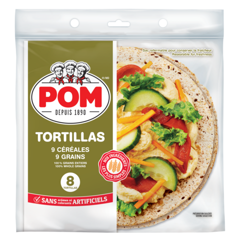 POM® 9 Grains Tortillas are made with 100% whole grains and no artificial flavours or colours. Baked with our simplest ingredients, they make delicious, restaurant-style meals you can wrap, roll or bake for a taste the whole family will love.