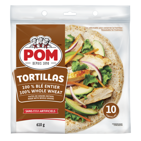 POM® 100% Whole Wheat Tortillas are full of whole grain goodness and no artificial flavours or colours.