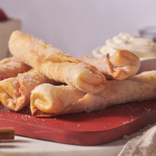 - Rouler chaque wrap dans le mélange de sucre et de cannelle et servir chaud avec de la crème glacée, de la crème fouettée ou du dulce de leche.
